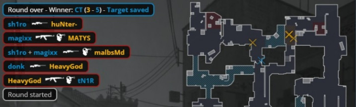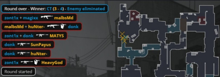 暂停回来,G2三人带包打A大三杀,donk与zont1x保枪让G2扳平比分。第7回合donk联手zont1x在B双人五杀拿到第4分。