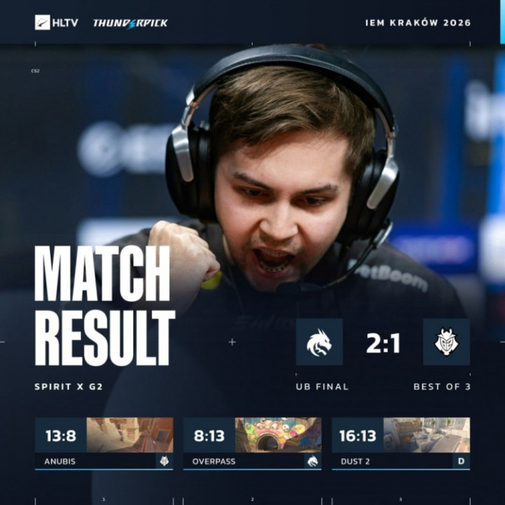 易边再战,手枪局双神三杀,G2完美团灭Spirit拿到第5分。次回合绿龙纯E,malbsmd特四杀拿到第6分。来到长枪回合,A小绿龙遭太阳神三杀送出第7分,随后MATYS与malbsmd双人四杀将比分扳平。
