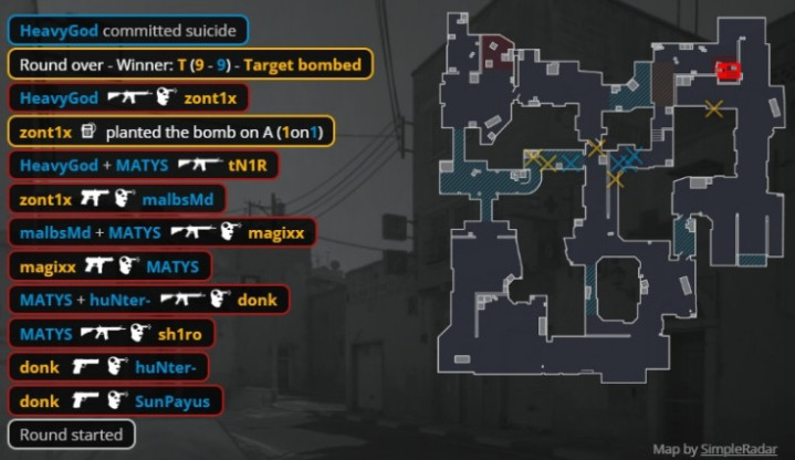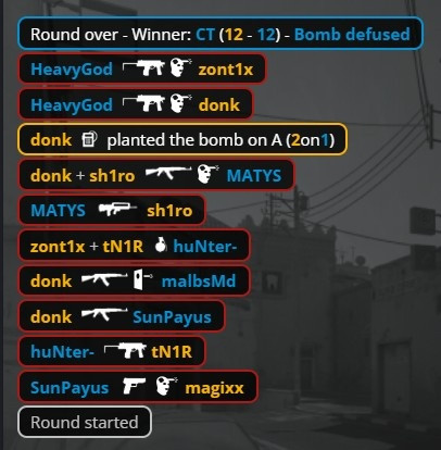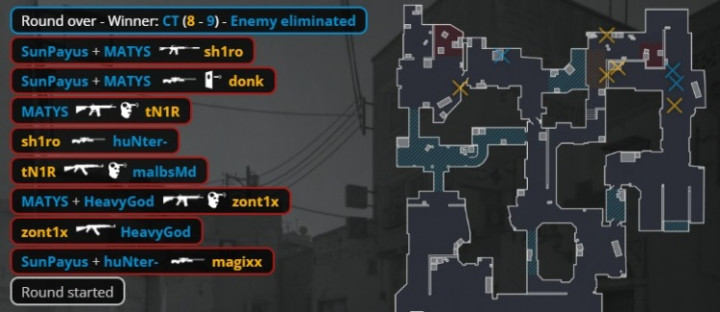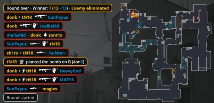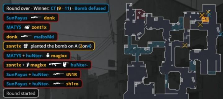 次回合donk沙鹰B1双杀A小hunter+太阳神,MATYS出A小打掉sh1ro后,donk捡到大狙也被MATYS打掉,zont1x残局单挑重神,zont1x捡到大狙进A下包,重神上A小,zont1x下CT,重神滴包打掉zont1x但没时间拆包被C4炸飞,双方9-9战平。